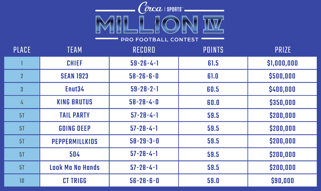 With 4,691 participants, the competition was thick and the prize pool was high. Every week of the contest, each team had the opportunity to pick 5 NFL sides against the spread. After 18 weeks of the NFL regular season, team CHIEF, a group of four friends, took home the $1 million grand prize after 90 picks and a record of 59-26-5. Second place went to SEAN 1923 for $500,000. Additionally the booby prize of $100,000 went to Big Booty Juedys, and four second-place booby prizes went to pisces1326, STONEY, Sunday Best, and Super Frog for $12,500 each. See below for Circa Sports Million IV Full Season winners and their performance: